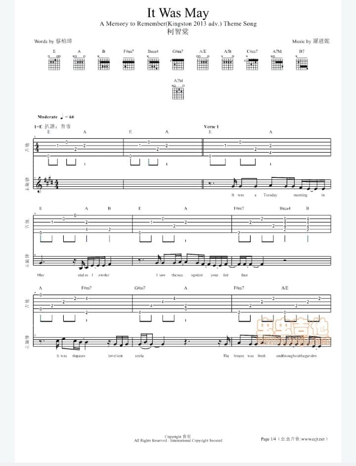 《It was may吉他譜_柯智棠_E調(diào)和弦TXT吉他譜》是由著名內(nèi)地歌手 柯智棠 演唱的《It was may》歌曲()編配,節(jié)拍4/4,吉他譜123免費(fèi)提供《It was may》完整文本TXT吉他譜(E調(diào)/和弦彈唱譜),此曲譜收錄于2018年01月。
